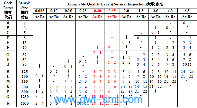 ↓= 使用箭頭向下第一個(gè)抽樣計(jì)劃,若抽樣數(shù)等于或大于批量數(shù)則作100%檢驗(yàn)。
